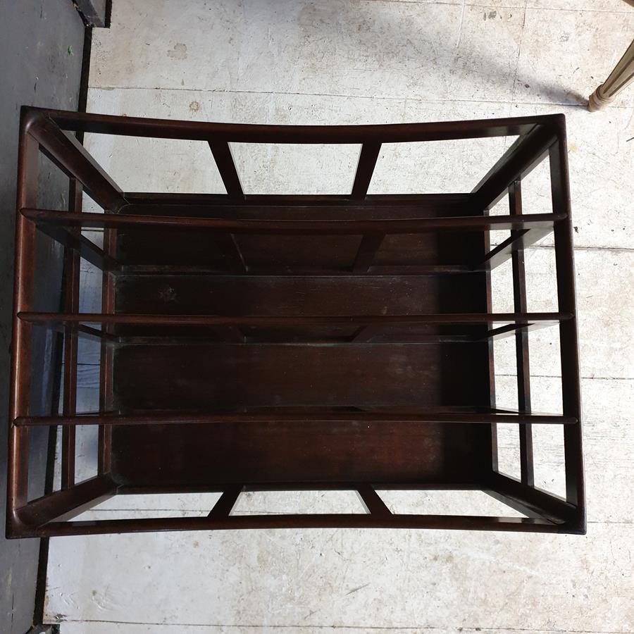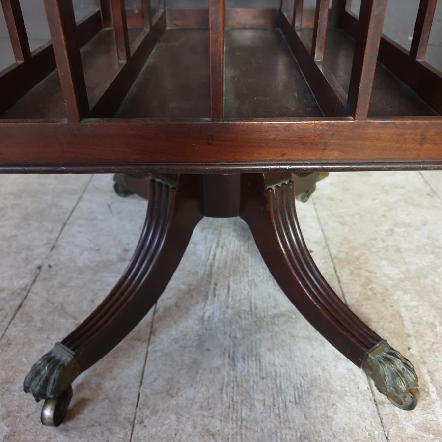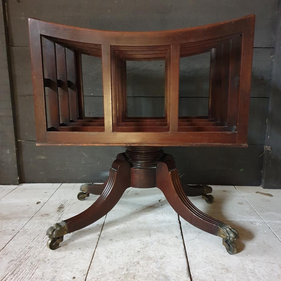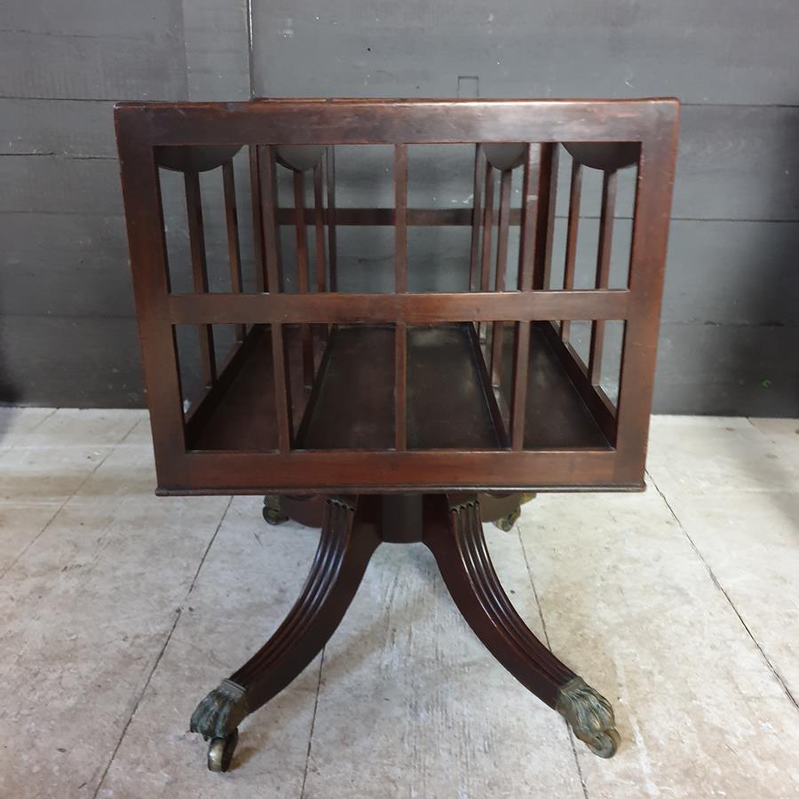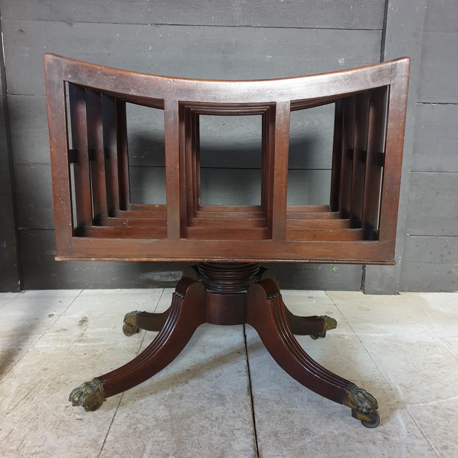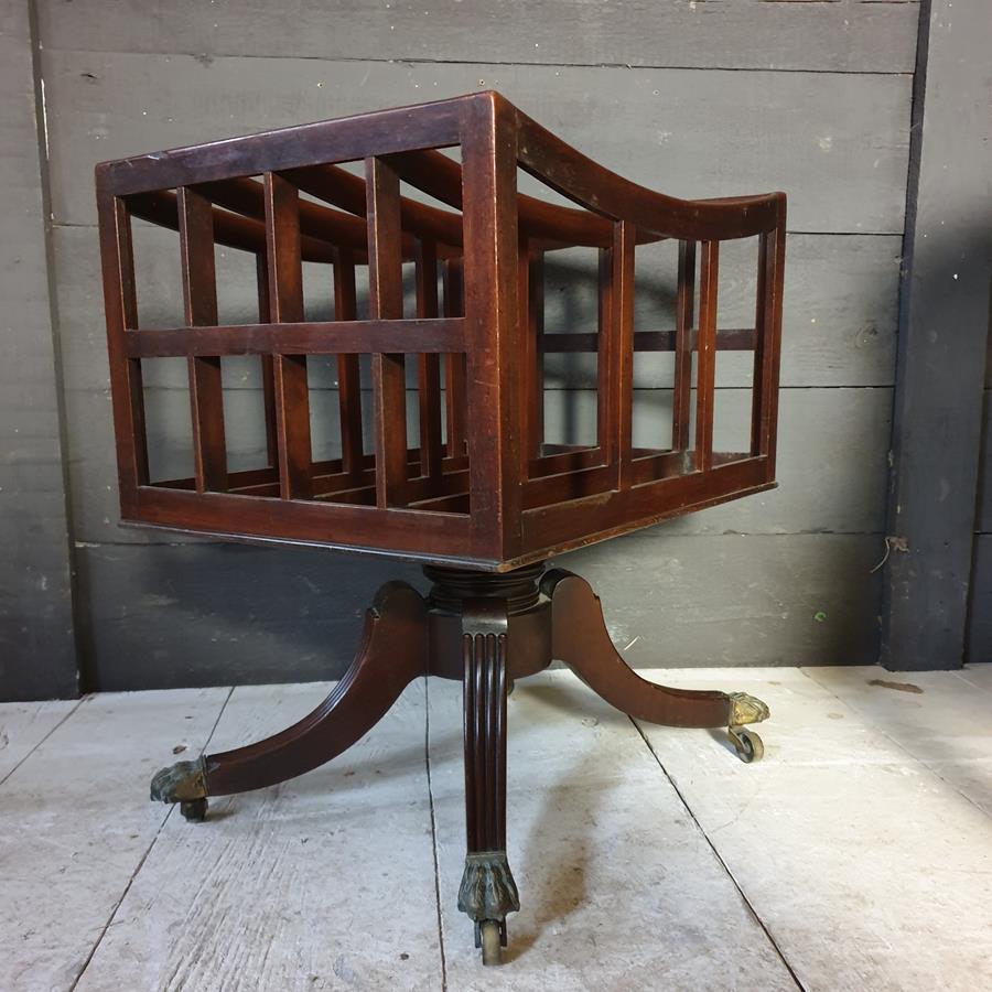 A mid 19th Century, mahogany four division Canterbury. The base has a turned support, with four reeded out swept legs, terminating with the original brass claw castors.