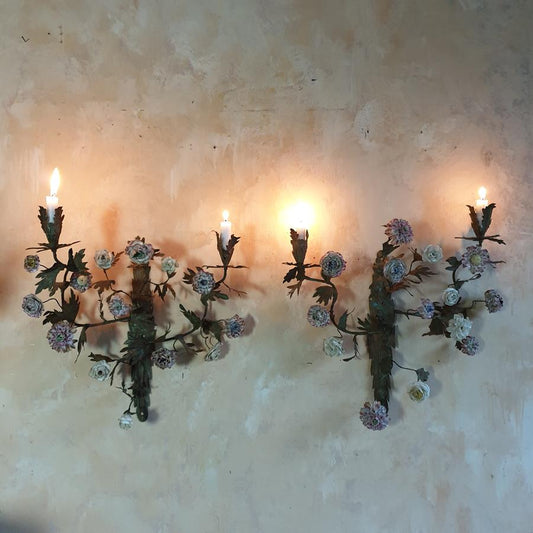 A pair of French painted tôle and porcelain wall-lights