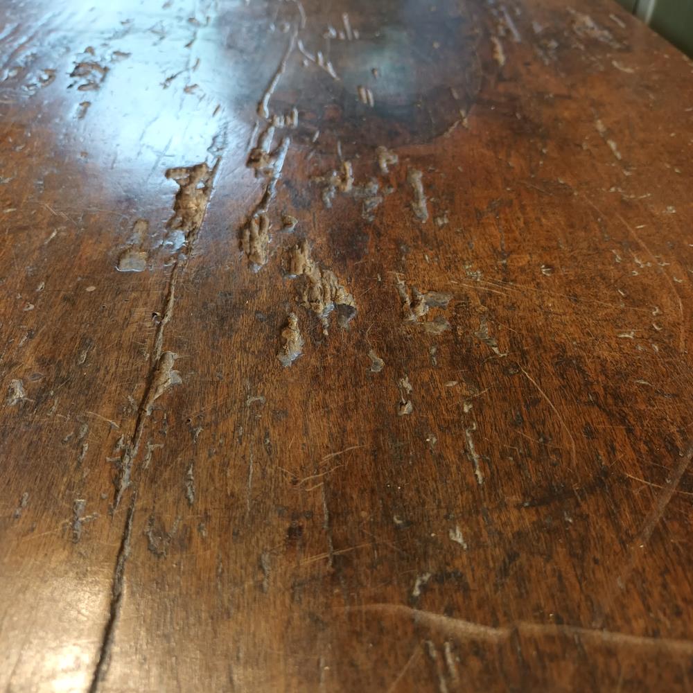 A 16th Century walnut plank coffer. The front plank has applied mouldings and a double lozenge either side of a pierced gothic tracery panel. There are four key holes and an iron lock plate. The sides both have applied mouldings and double lozenge mouldings. The single plank top is attached by a pair of 17th Century strap hinges, the original iron wires long perished. There is a repeating stamped motif running around the top edge on the inside, possibly Swiss.
