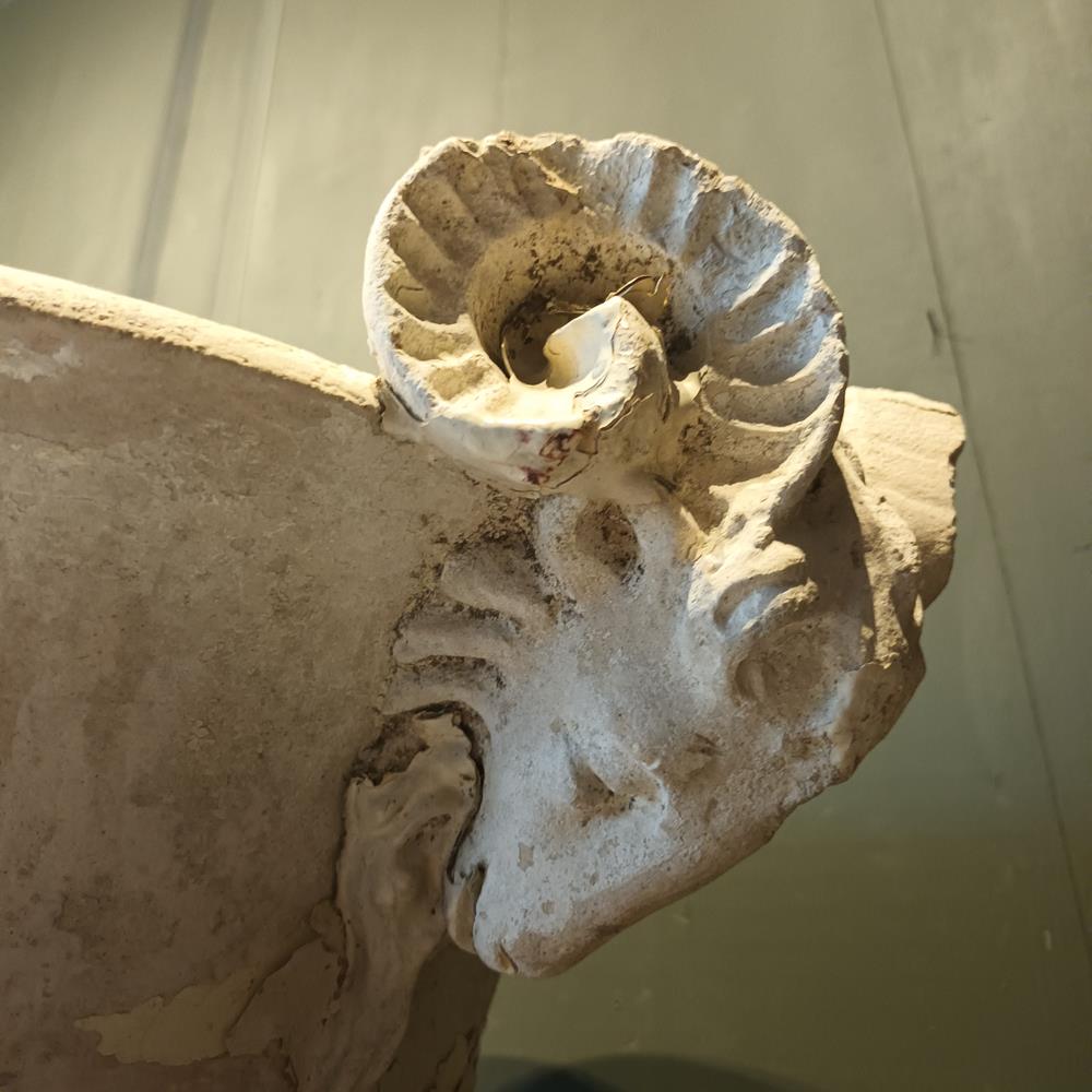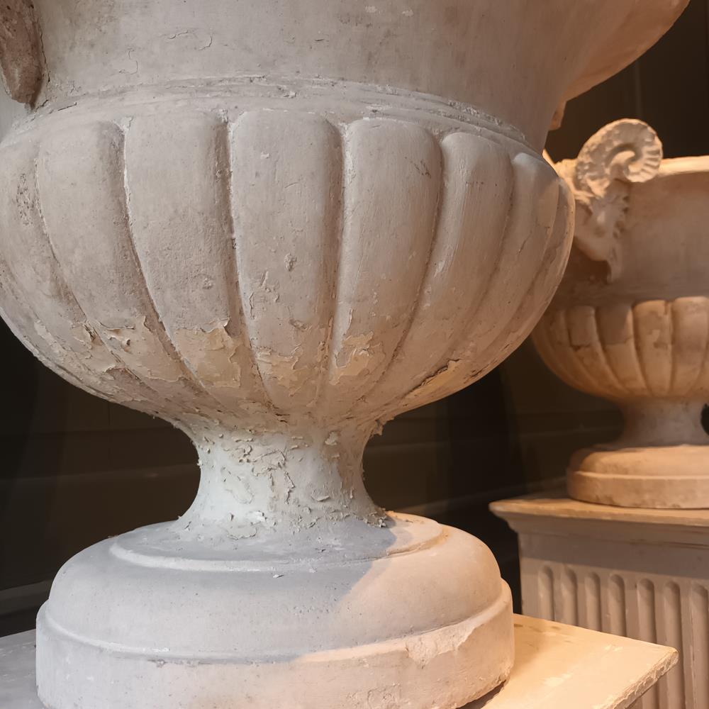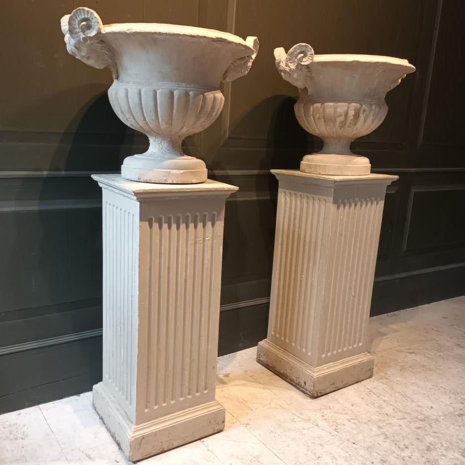 A wonderful pair of 19th Century, French Limestone urns, each finely carved ram's head is bearded and has generously ribbed, curled horns. The gadrooned bowl is supported on a round socle and base. Each urn sits on a free standing, fluted and moulded later oak plinth.