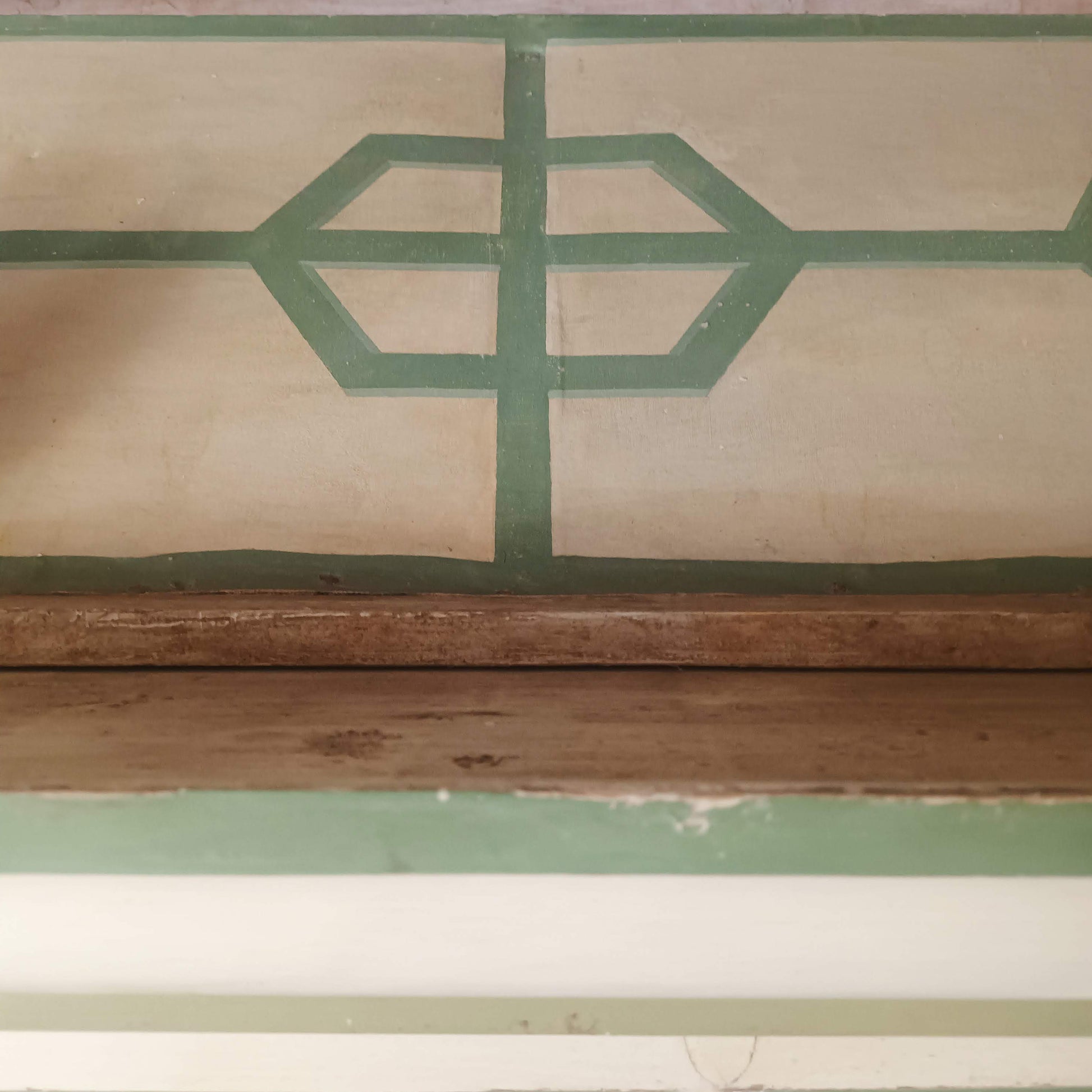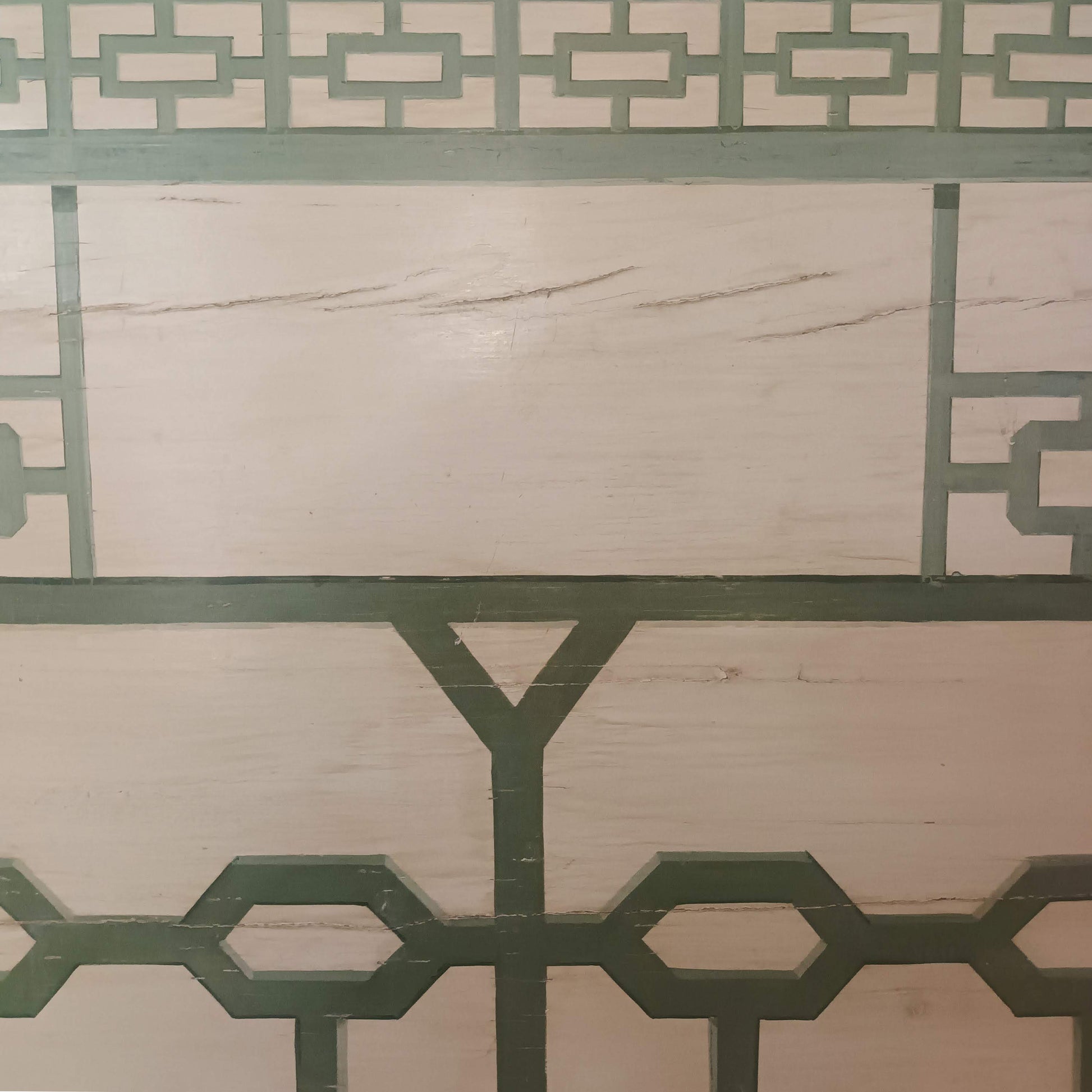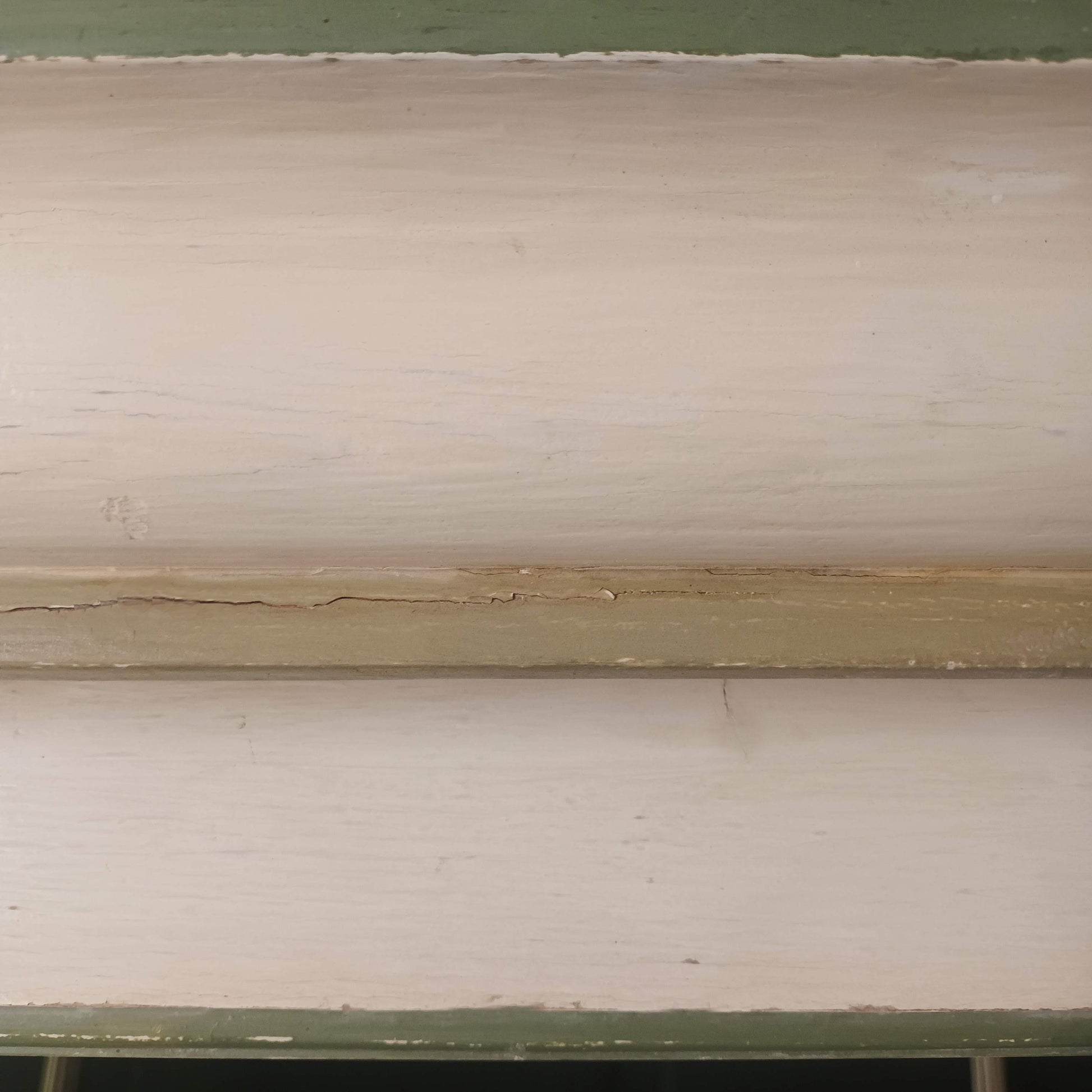 The whole bed is lacquered in an off-white and is decorated in various greens. The bed is bolted and screwed together and can be fully dismantled.