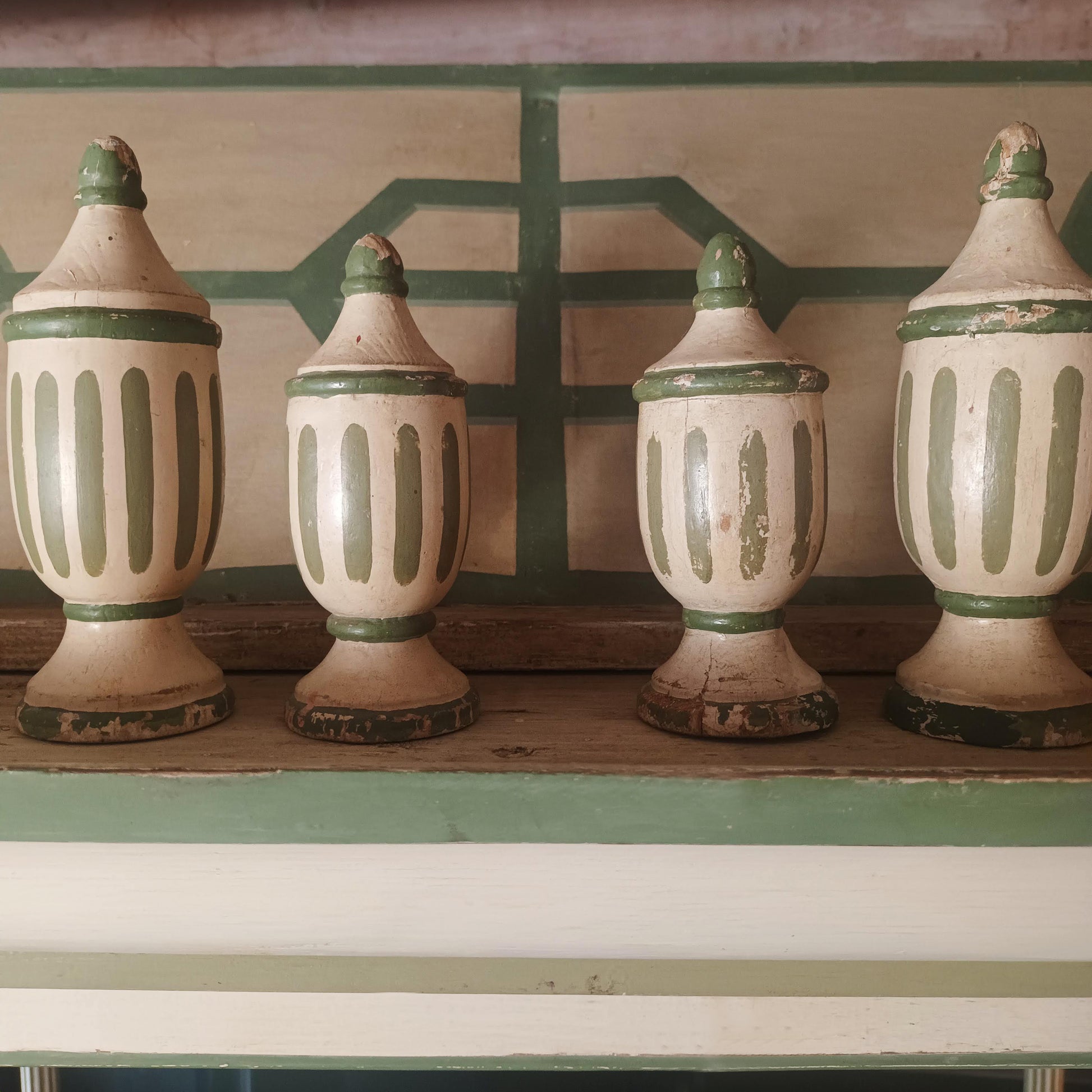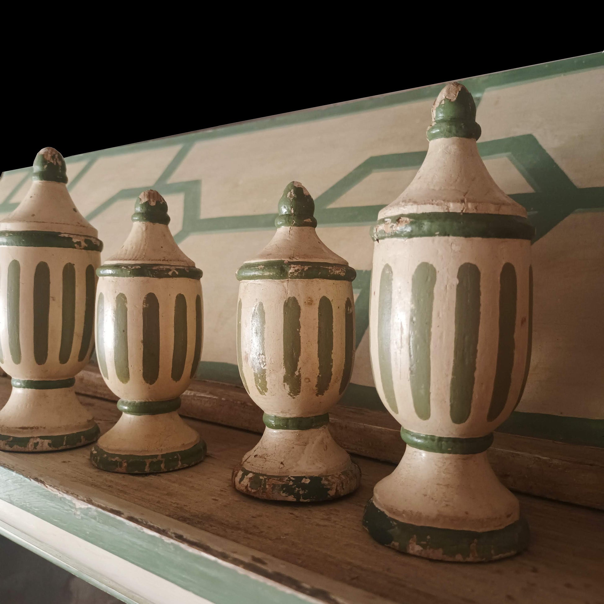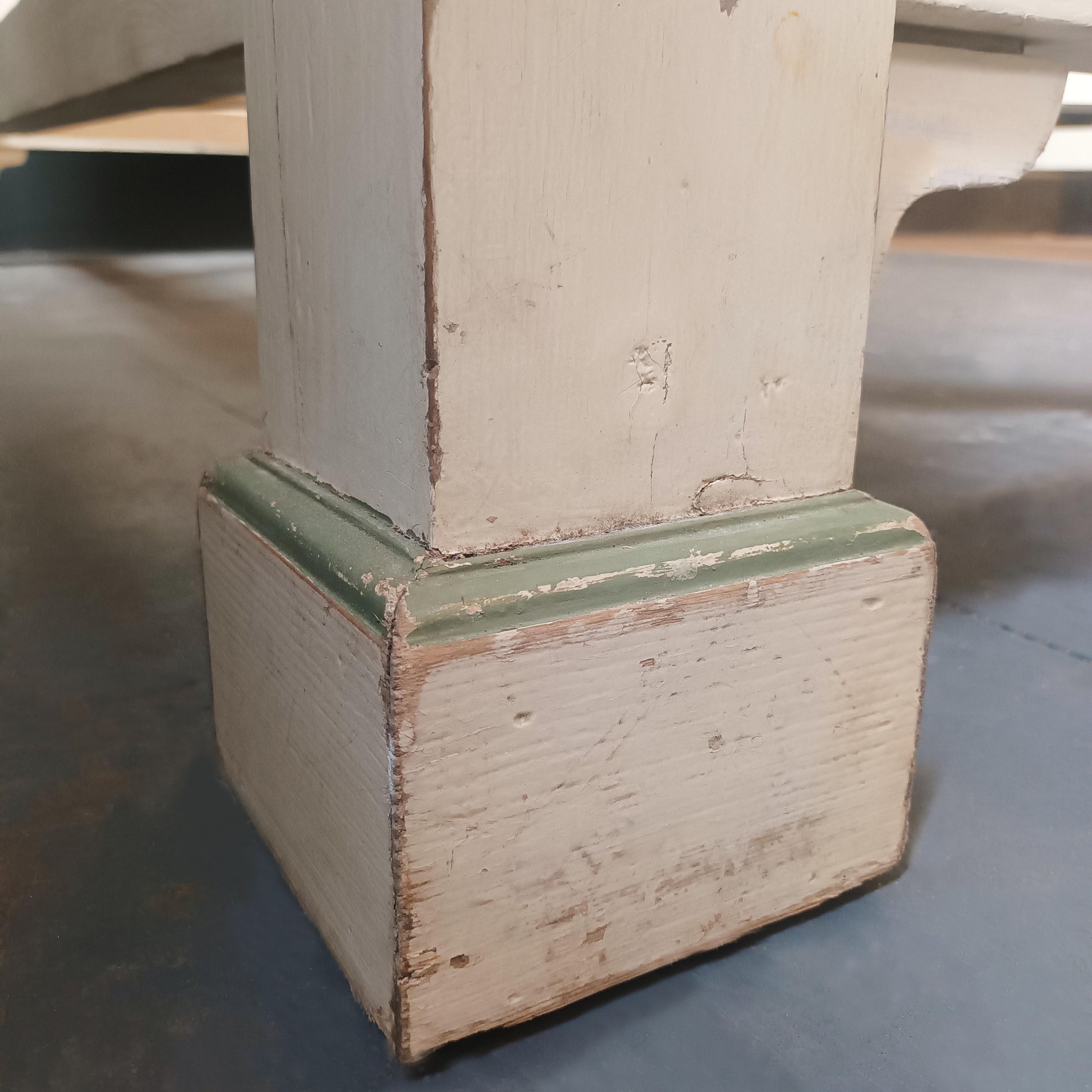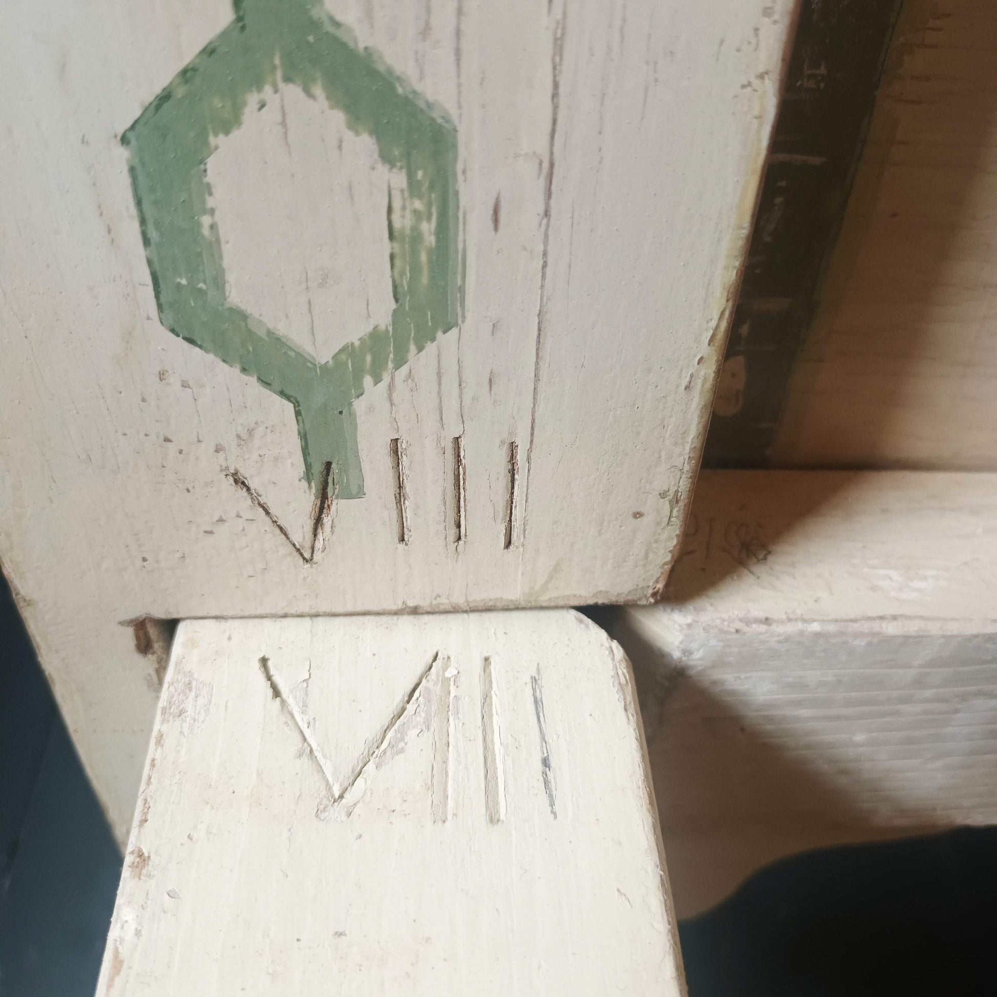 The whole bed is lacquered in an off-white and is decorated in various greens. The bed is bolted and screwed together and can be fully dismantled.