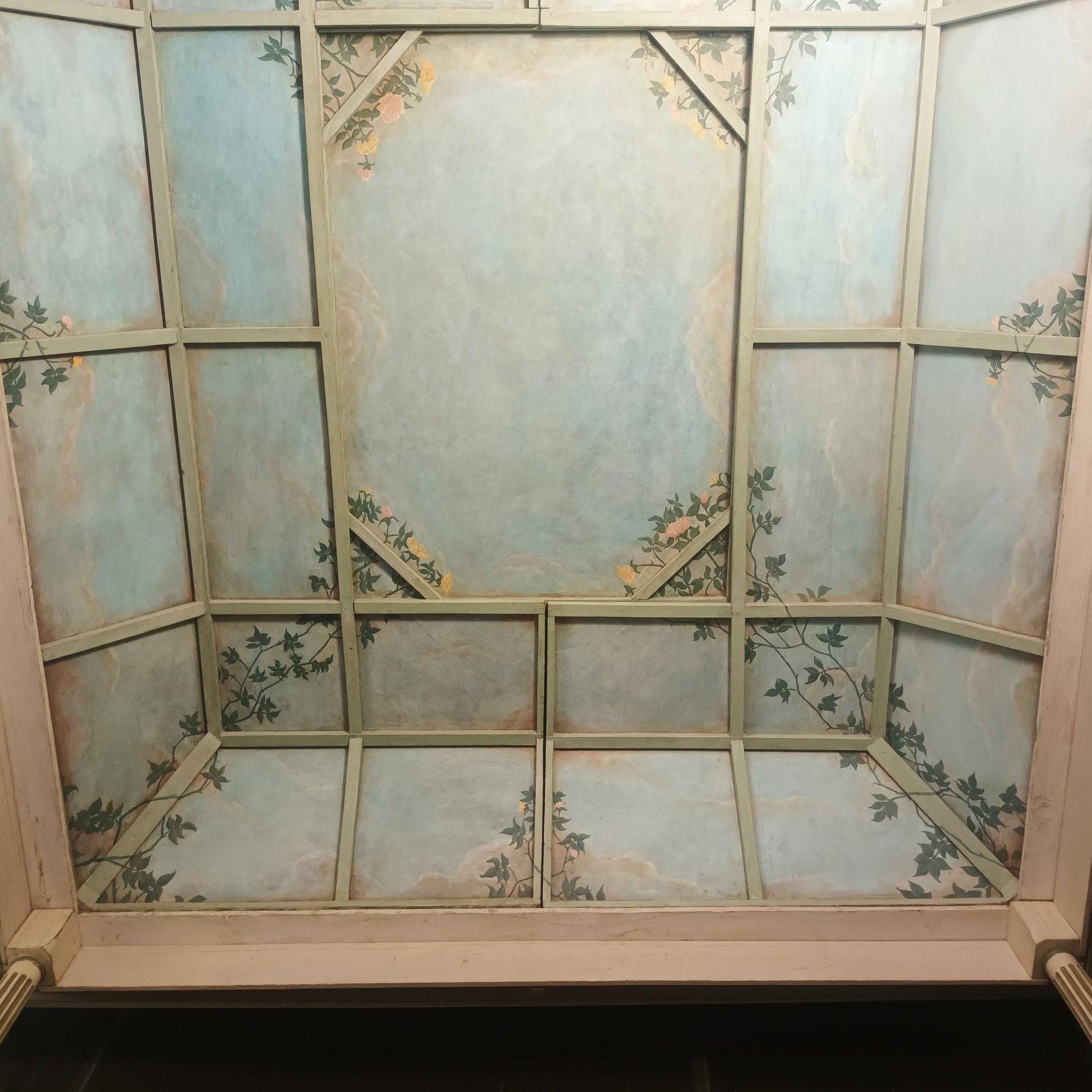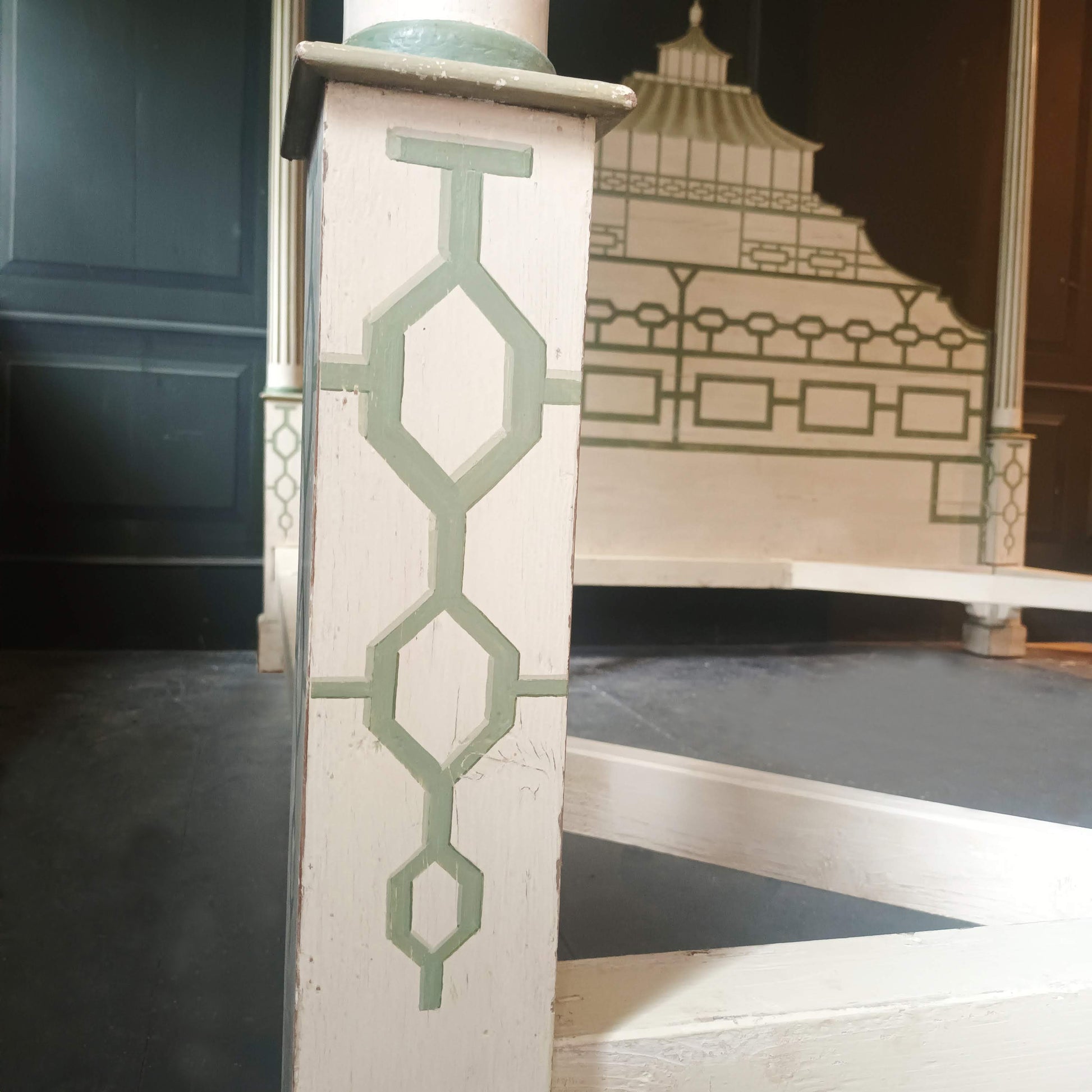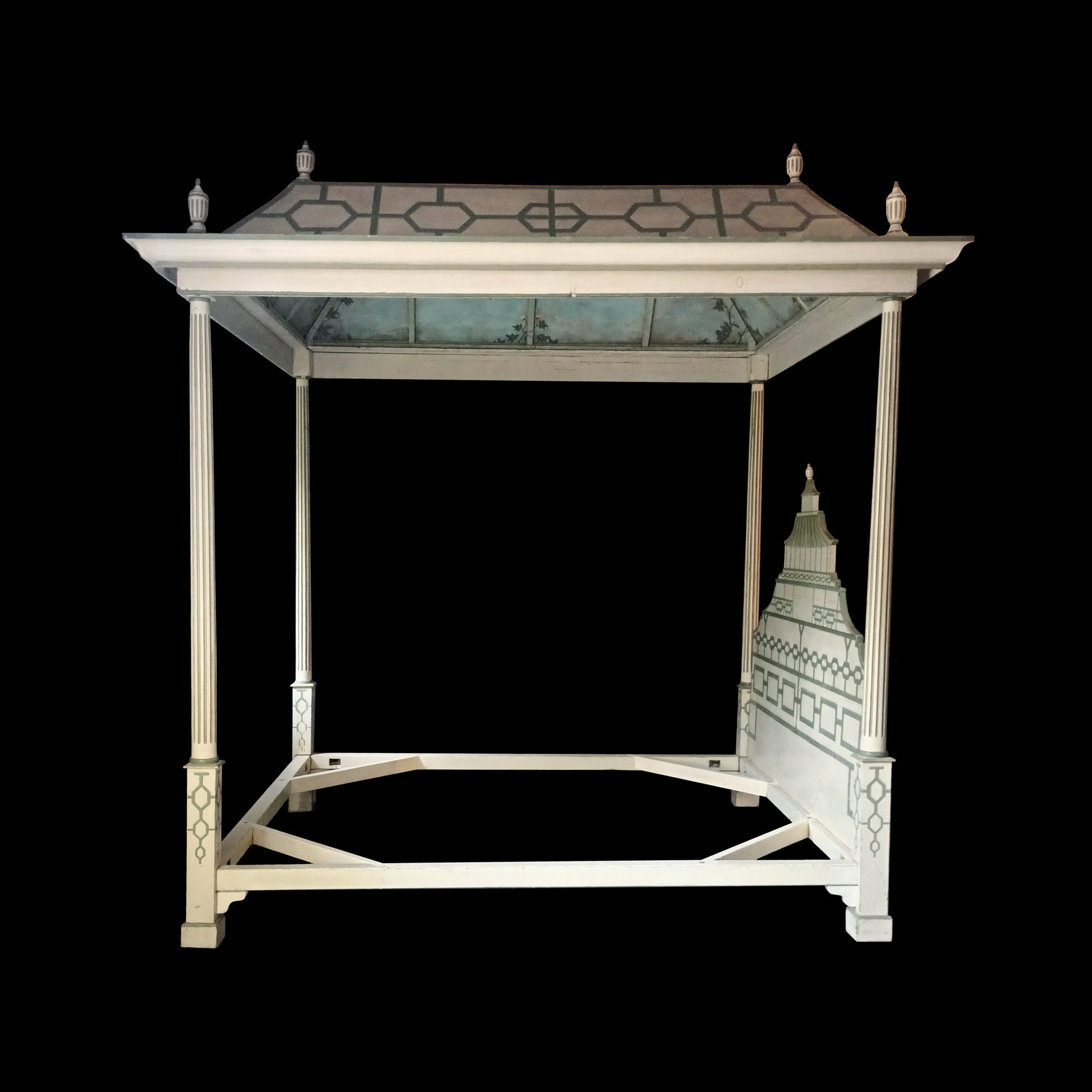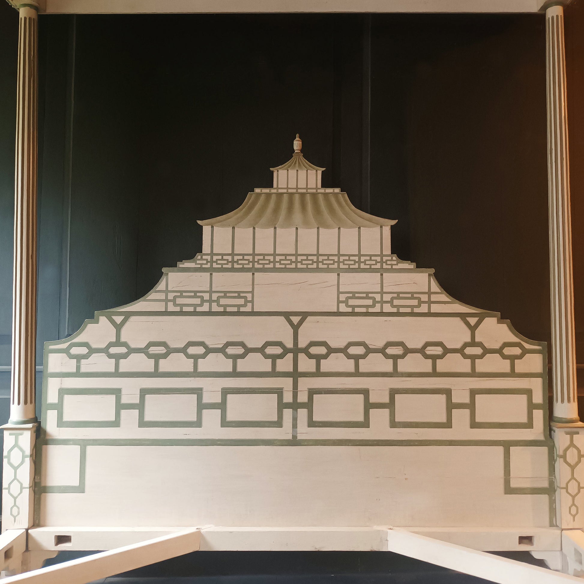On the headboard the chinoiserie trellis work decoration is topped with a pagoda and turned finials. The four turned posts are fluted all around and are supported by square decorative posts, with porcelain castors. These posts support the cornice with hidden curtain rails and runners. This in turn supports the wood and canvas tester. On the outside of the tester there is a similar trellis work pattern and eight turned finials with imitation fluting. The inside of the tester is painted with a sky scape of clouds and pink and yellow trailing roses.