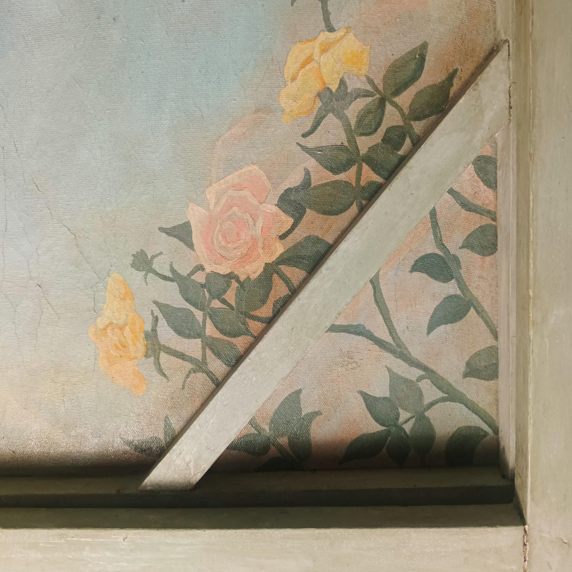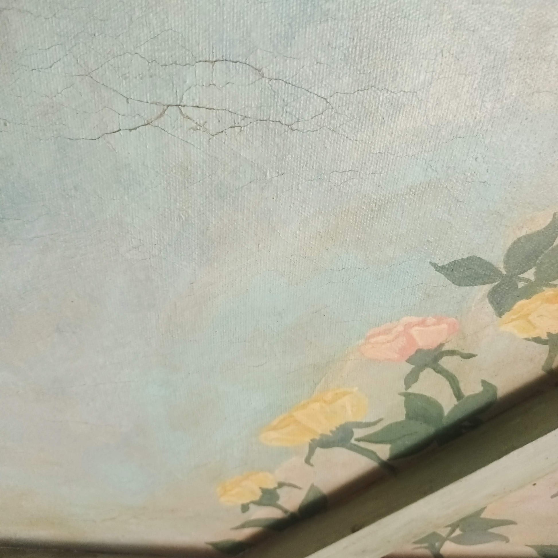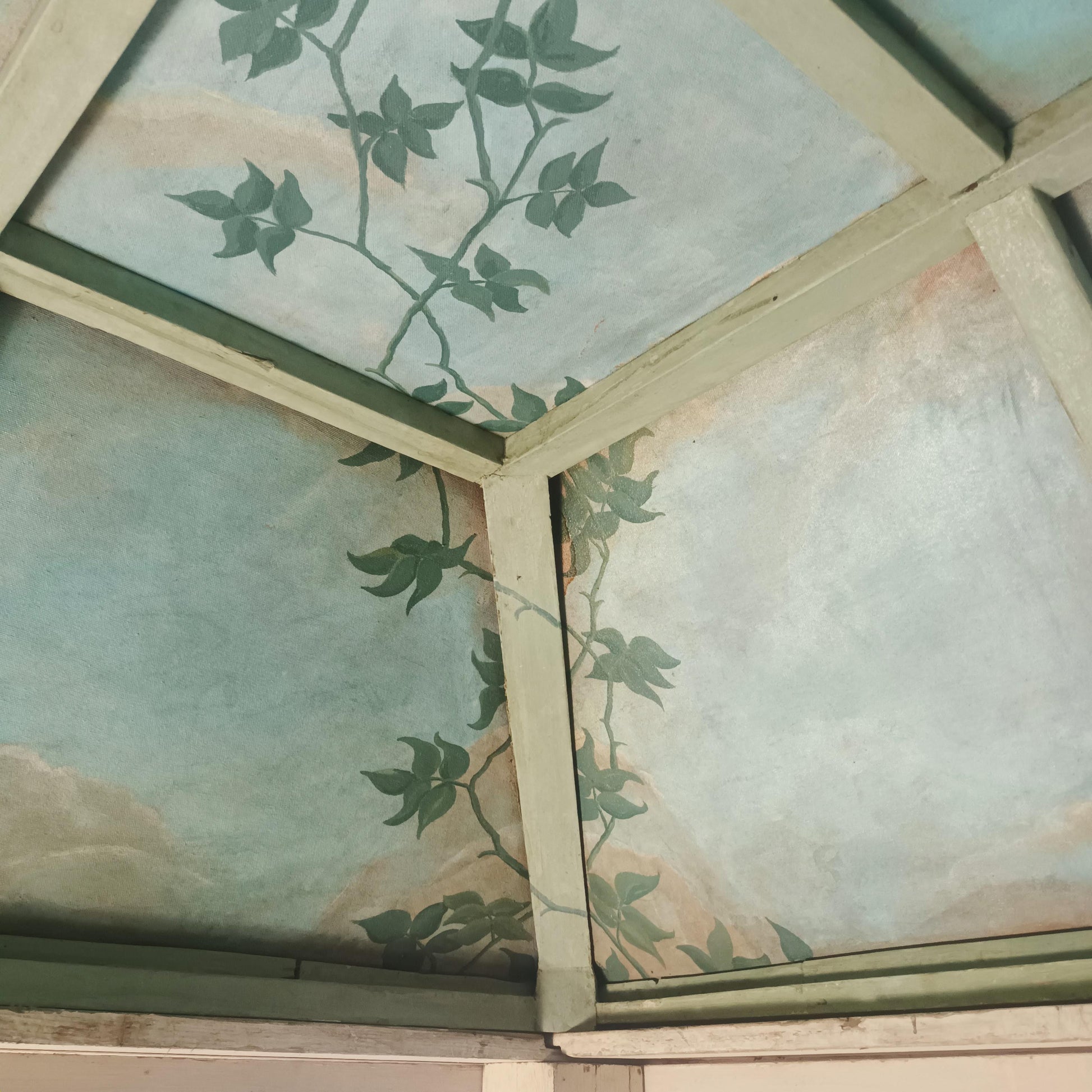 On the headboard the chinoiserie trellis work decoration is topped with a pagoda and turned finials. The four turned posts are fluted all around and are supported by square decorative posts, with porcelain castors. These posts support the cornice with hidden curtain rails and runners. This in turn supports the wood and canvas tester. On the outside of the tester there is a similar trellis work pattern and eight turned finials with imitation fluting. The inside of the tester is painted with a sky scape of clouds and pink and yellow trailing roses.