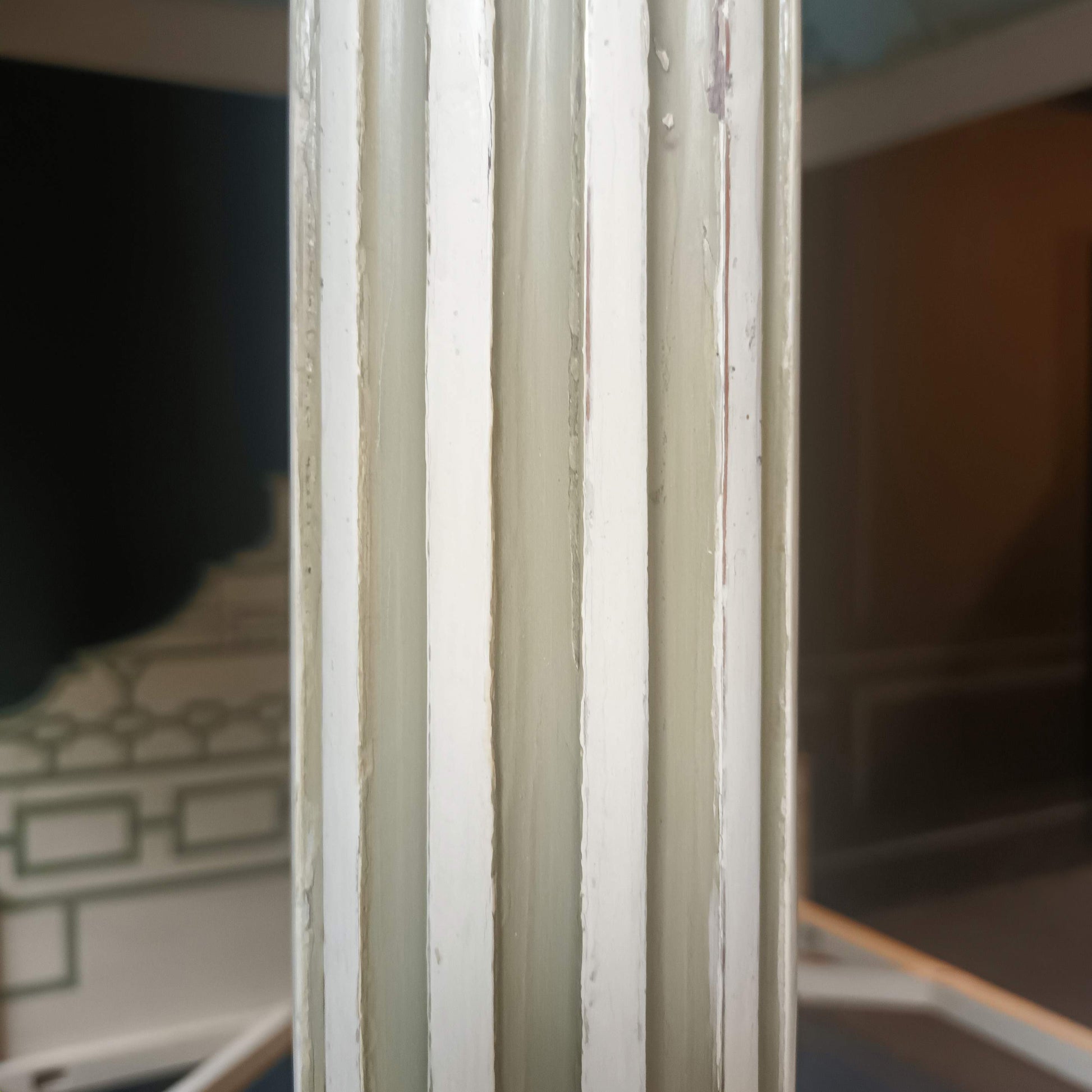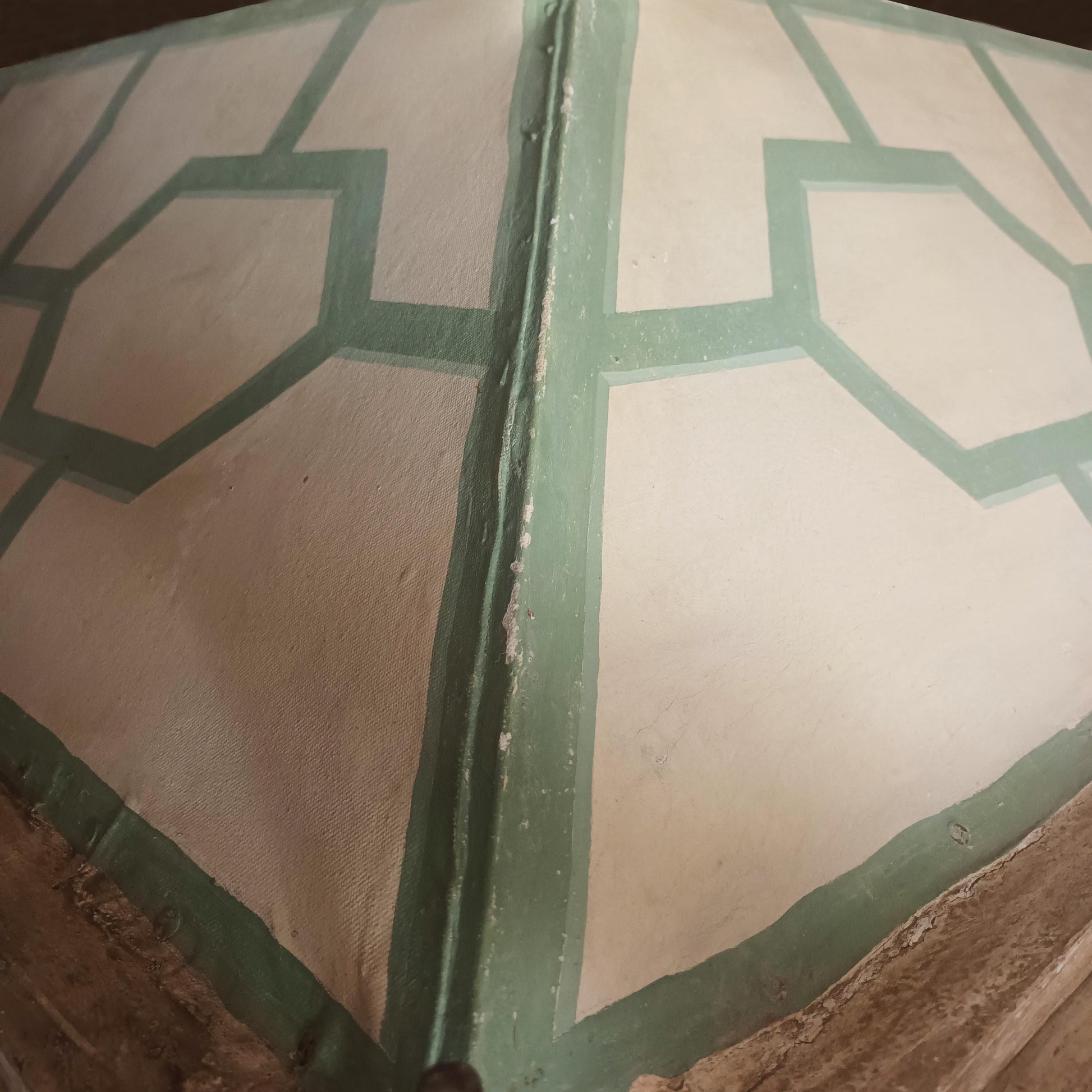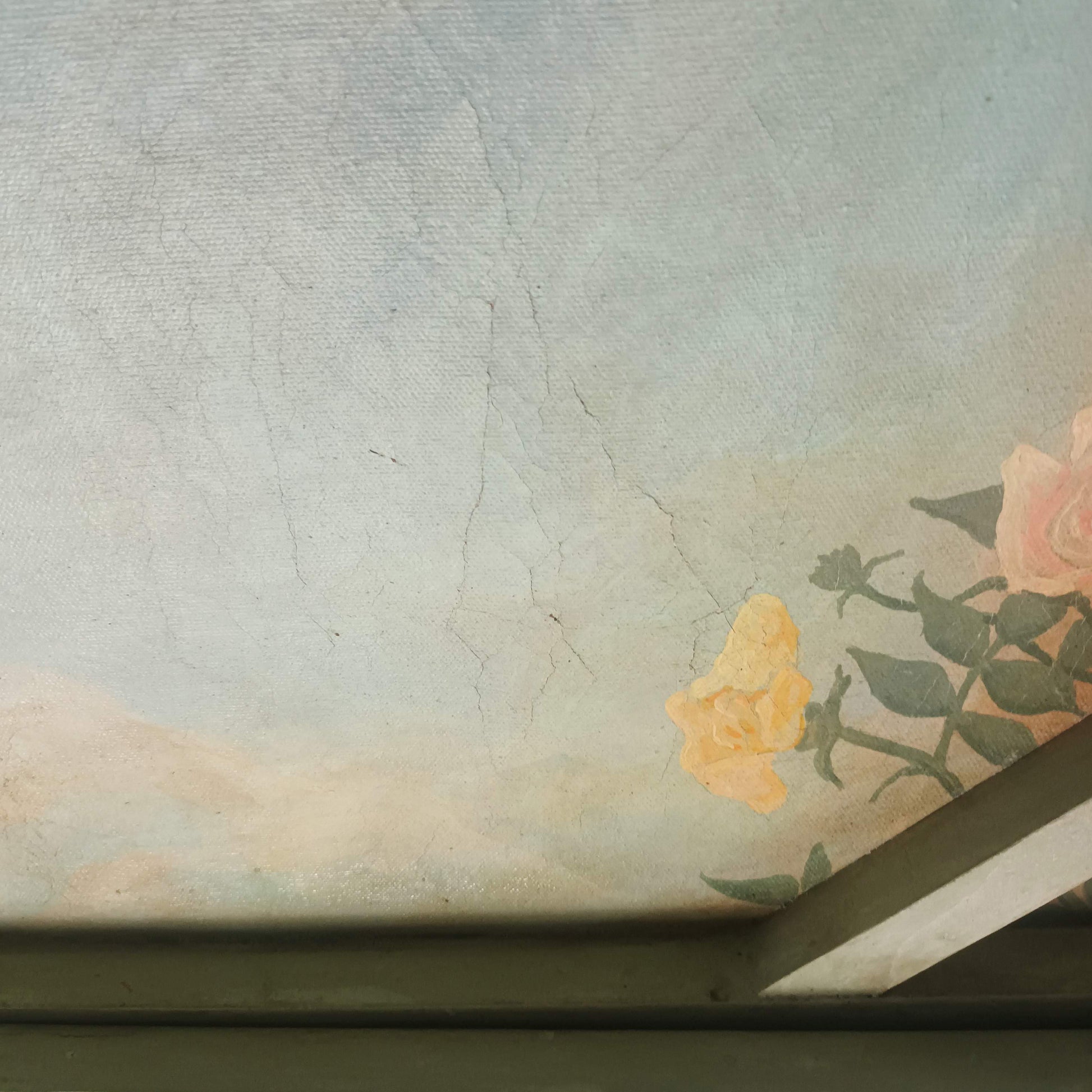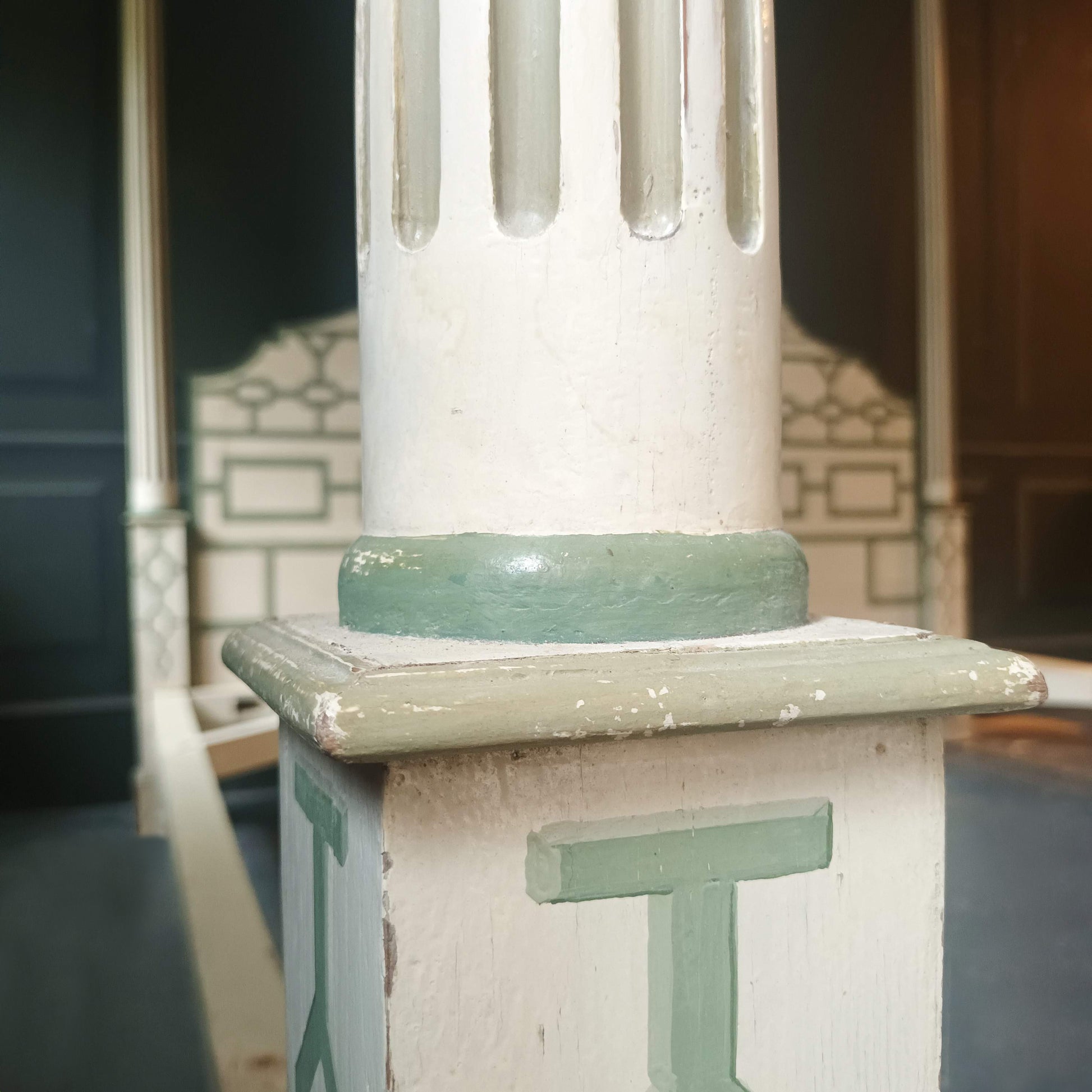 On the headboard the chinoiserie trellis work decoration is topped with a pagoda and turned finials. The four turned posts are fluted all around and are supported by square decorative posts, with porcelain castors. These posts support the cornice with hidden curtain rails and runners. This in turn supports the wood and canvas tester. On the outside of the tester there is a similar trellis work pattern and eight turned finials with imitation fluting. The inside of the tester is painted with a sky scape of clouds and pink and yellow trailing roses.
