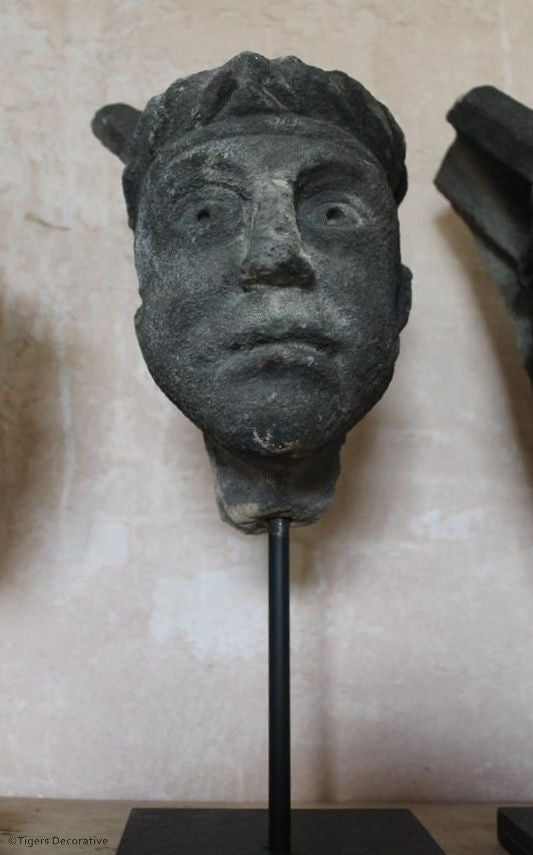 An interesting set of four ornately carved medieval sandstone heads, possibly 18th century replacements, which have now been mounted on painted steel stands. These were blown off St Boniface's church in Bunbury, Cheshire, by a parachute bomb dropped in 1940.
