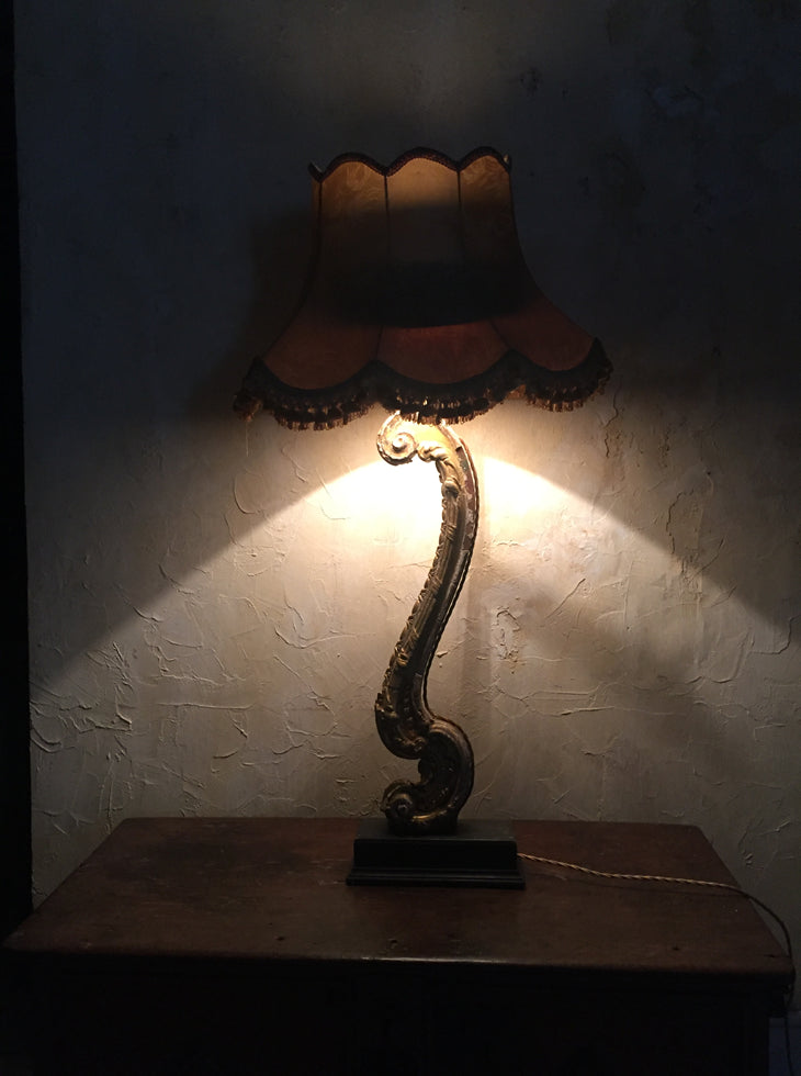 A mid 19th century carved and gilded furniture fragment, with ancanthus and scrolled motifs. It has now been converted in to a lamp, with gold, silk braided flex.