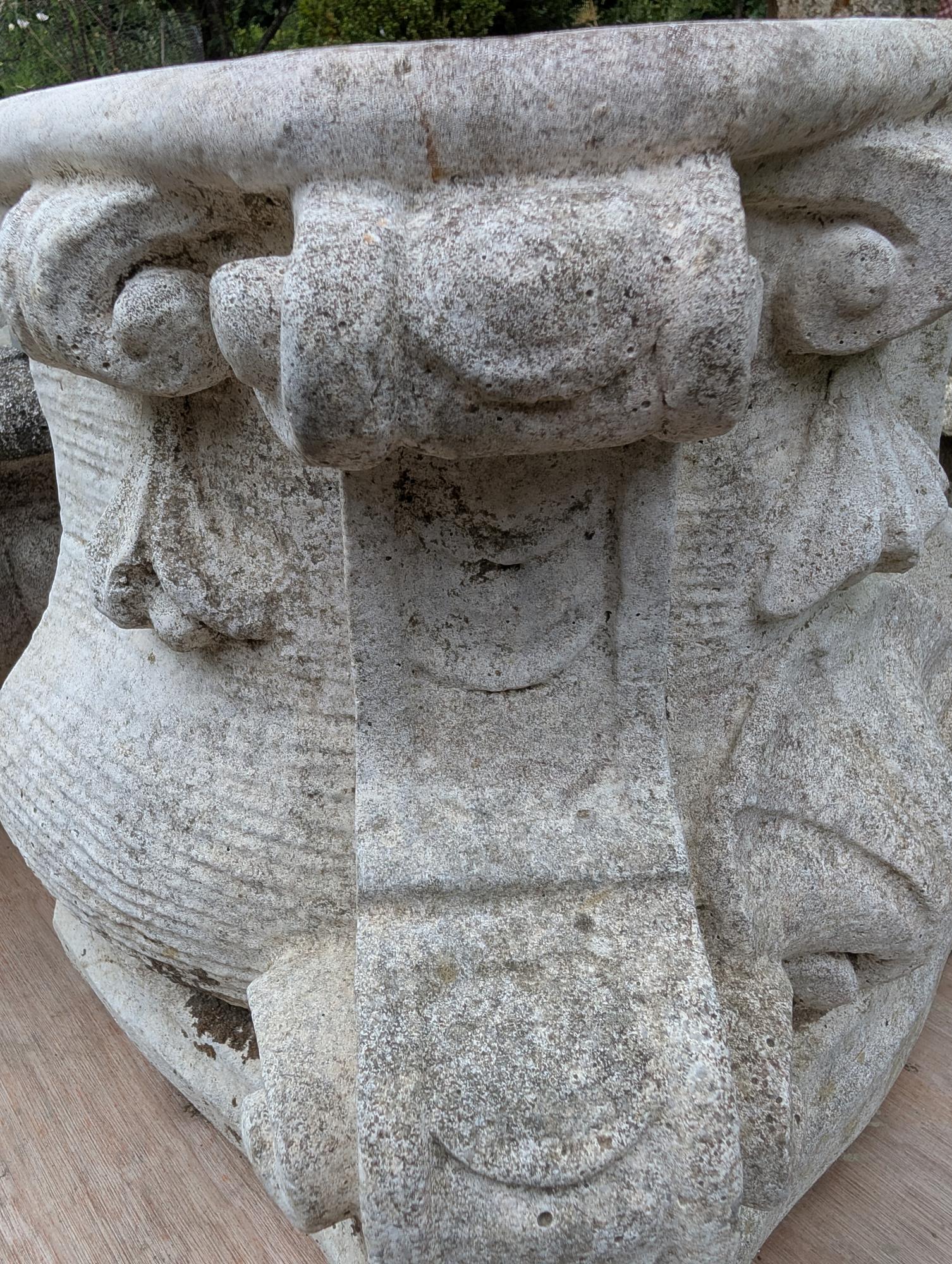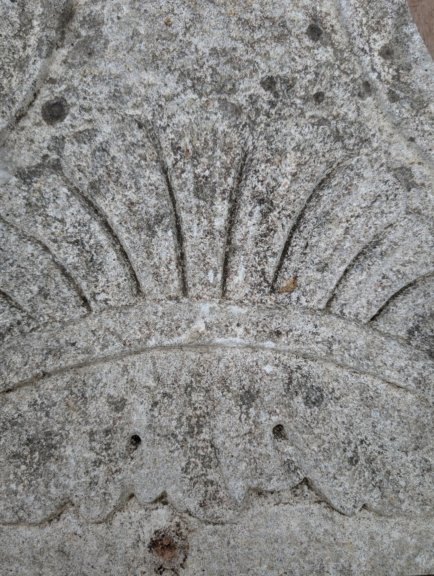 A marble Di Latte wall mounted fountain, in the Baroque style, this piece sits on a scrolled and scaled base, with a clamshell central motif. This supports a semi circular scalloped edge, deeply gadrooned bowl. This in turn supports a scrolled top with a lion's head fountain, with copper spout. It is signed Papina, Circa 1960.
