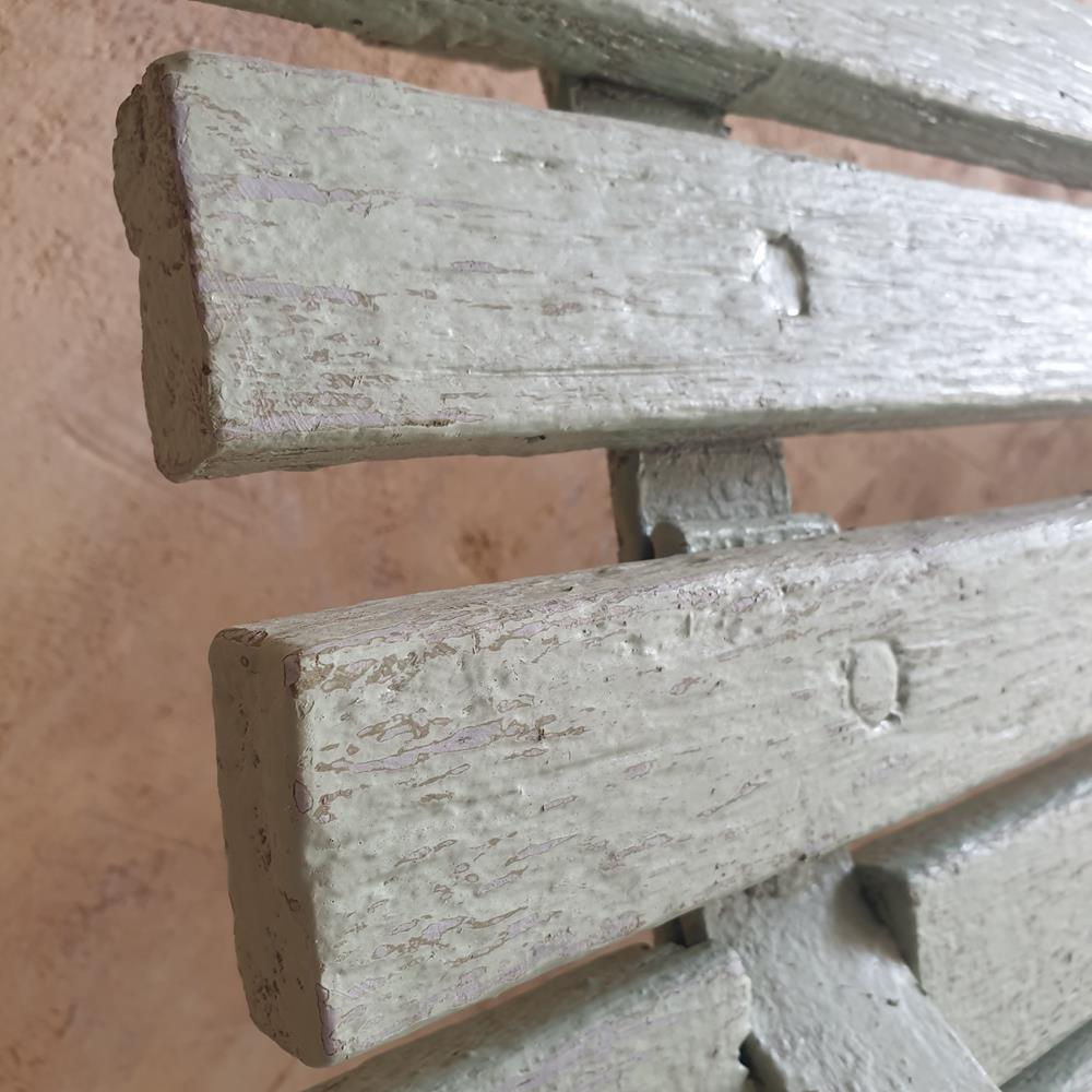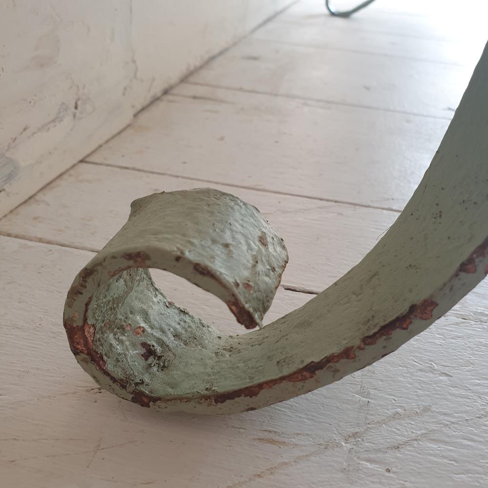 A late 19th / early 20th Century scrolled garden bench, with three supports and curved wooden slates. Stamped with the name DREW.